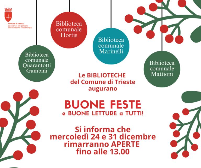 Il Servizio Scuola, Educazione e Biblioteche del Comune di Trieste informa tutti gli utenti che mercoledì 24 e 31 dicembre 2025 le Biblioteche Hortis, Quarantotti Gambini, Mattioni,
