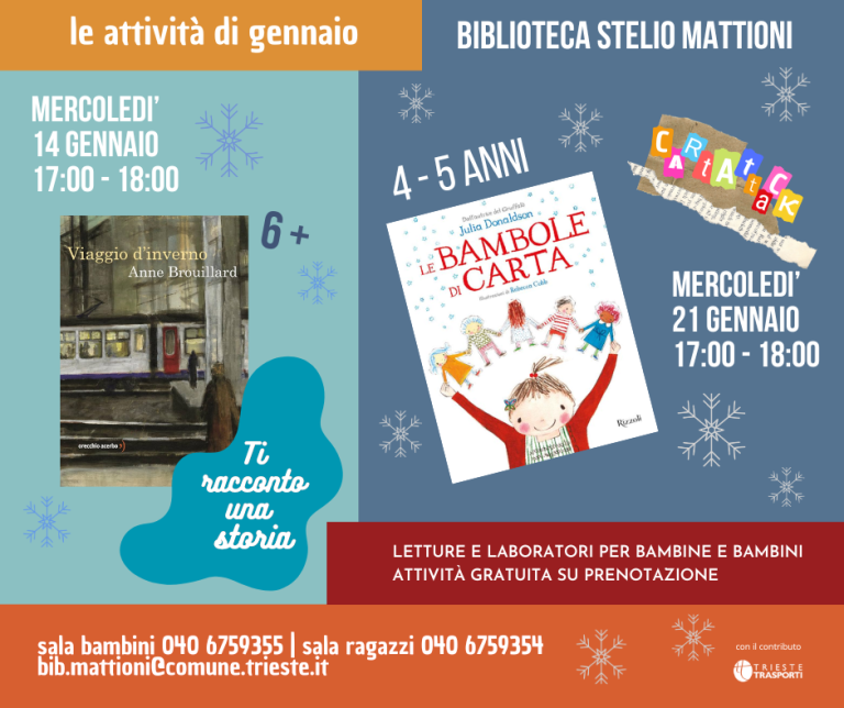 Le attività dedicate ai bambini riprendo a gennaio con due appuntamenti. Mercoledì 14 gennaio dalle 17.00 la Sala Ragazzi dedica una lettura – laboratorio al